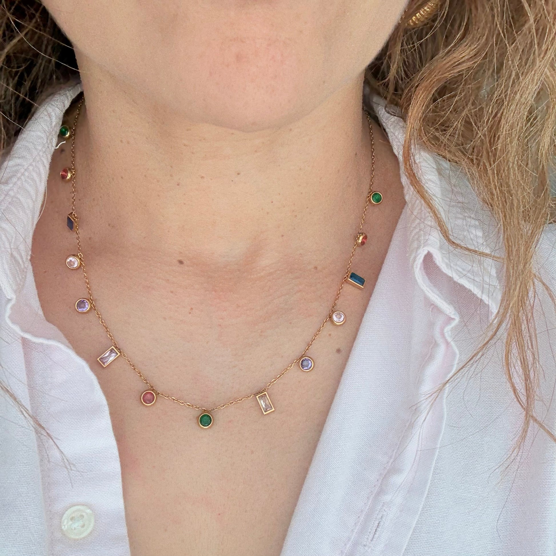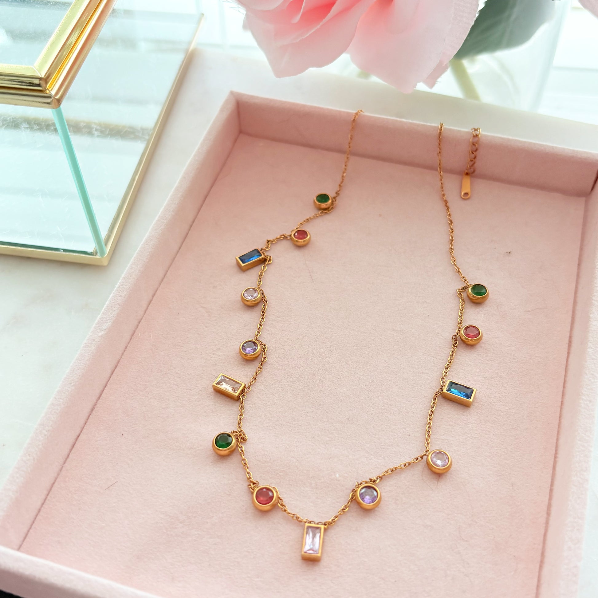 A delicate waterproof necklace in stainless steel, featuring colorful crystal drops that shine with every movement. Inspired by the name Sienna, symbolizing warmth, creativity, and elegance—perfect for adding a touch of color and meaning to your everyday look.